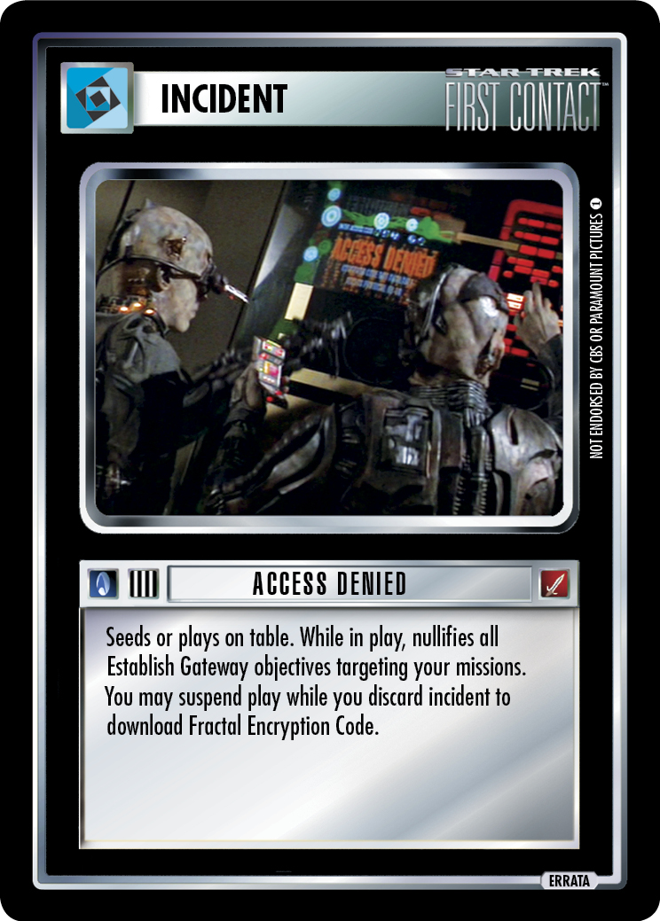 Seeds or plays on table. While in play, nullifies all Establish Gateway objectives targeting your missions. You may suspend play while you discard incident to download Fractal Encryption Code.