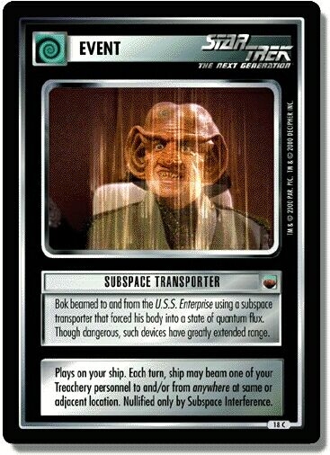 Plays on your ship. Each turn, ship may beam one of your Treachery personnel to and/or from anywhere at same or adjacent location. Nullified only by Subspace Interference.