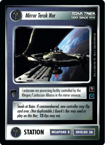 Cardassian version: Seeds at Bajor. If commandeered, new controller may flip card over. (Not duplicatable.) Quark's Bar may seed or play on this Nor;