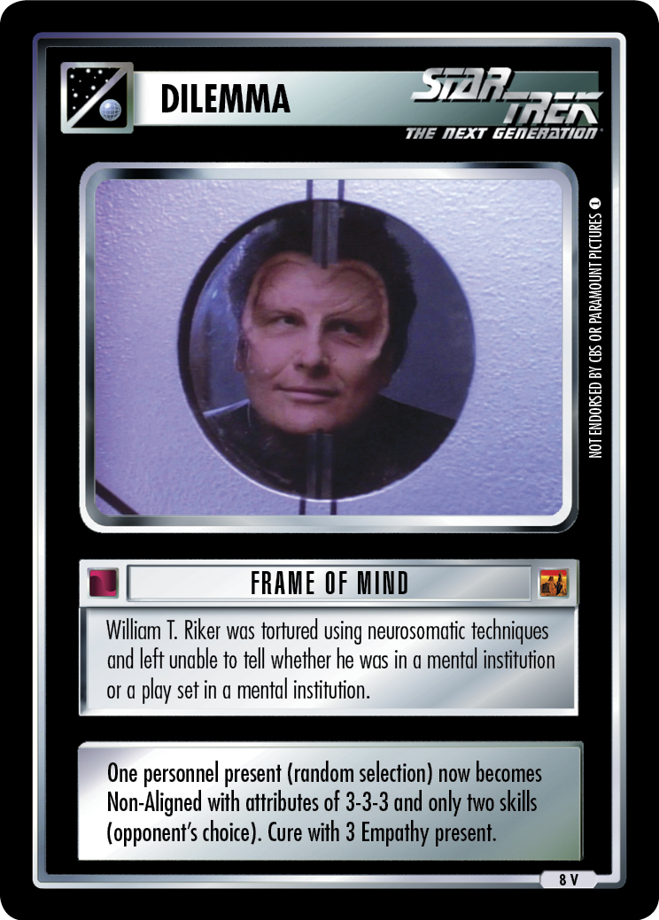 The personnel affected by this dilemma loses affiliation (as with Memory Wipe). All skills are lost and any two regular skills in the game may be selected. See timeline disruption, skills - modifying.