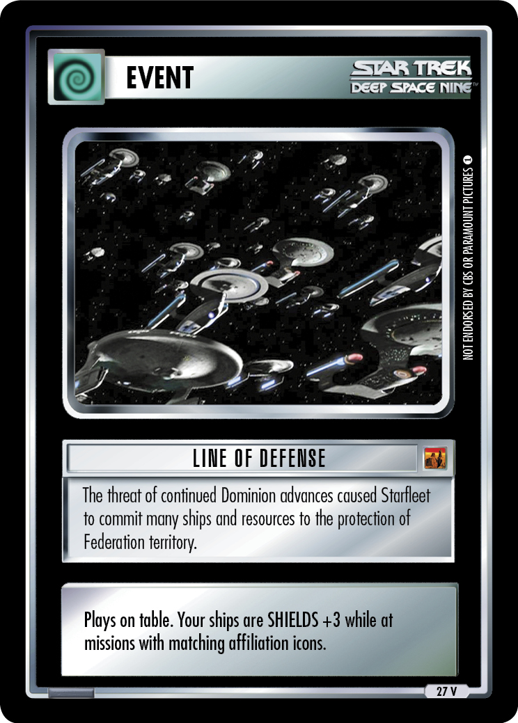 Plays on table. Your ships are SHIELDS +3 while at missions with matching affiliation icons.