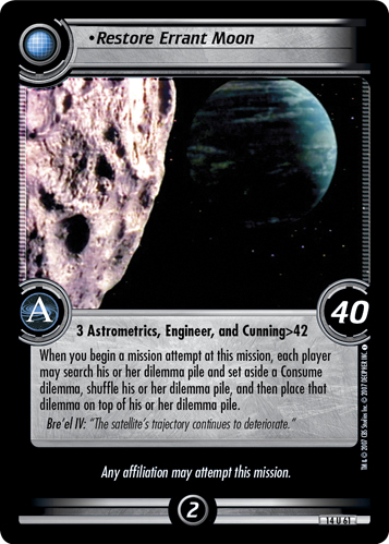 Create your own Deck in the ST2E deck section!There are 6 entries for Restore Errant Moon (ST2E 14 U 61) at the Tradeplace (0 haves and 6 wants). Click here to see all trade list entries for this Uncommon card!