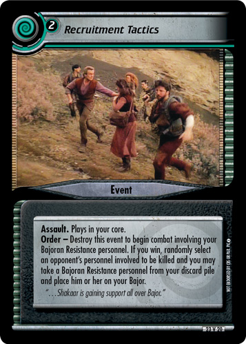 Order - Destroy this event to begin combat involving your Bajoran Resistance personnel. If you win, randomly select an opponent’s personnel involved to be killed and you may take a Bajoran Resistance personnel from your discard pile and place him or her on your Bajor.