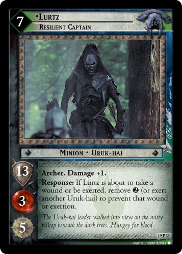 Response: If Lurtz is about to take a wound or be exerted, remove 2 (or exert another Uruk-hai) to prevent that wound or exertion.